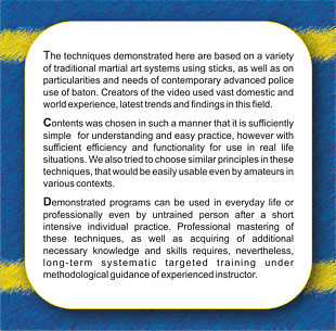 This training DVD explains very illustratively basic principles and elements of use of expandable baton and its accessories. It contains 16 chapters, duration of the film is 59 minutes.