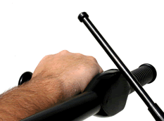 - The button-shaped end of the lateral handle ensures a firm grip and rotation of the tonfa, a point at the end of the button makes it possible to use it as an effective hammer; for example, for smashing glass, etc.